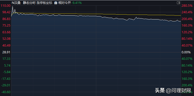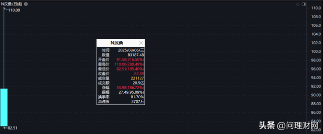 8月6日,新股N汉桑(301491)上市首日开盘价91.5元,涨幅216.5%,盘中最高涨至110元,涨幅高达280.49%,至收盘股价报收82.89元,涨幅186.7%,当日成交20.5亿元,换手率81.7%。